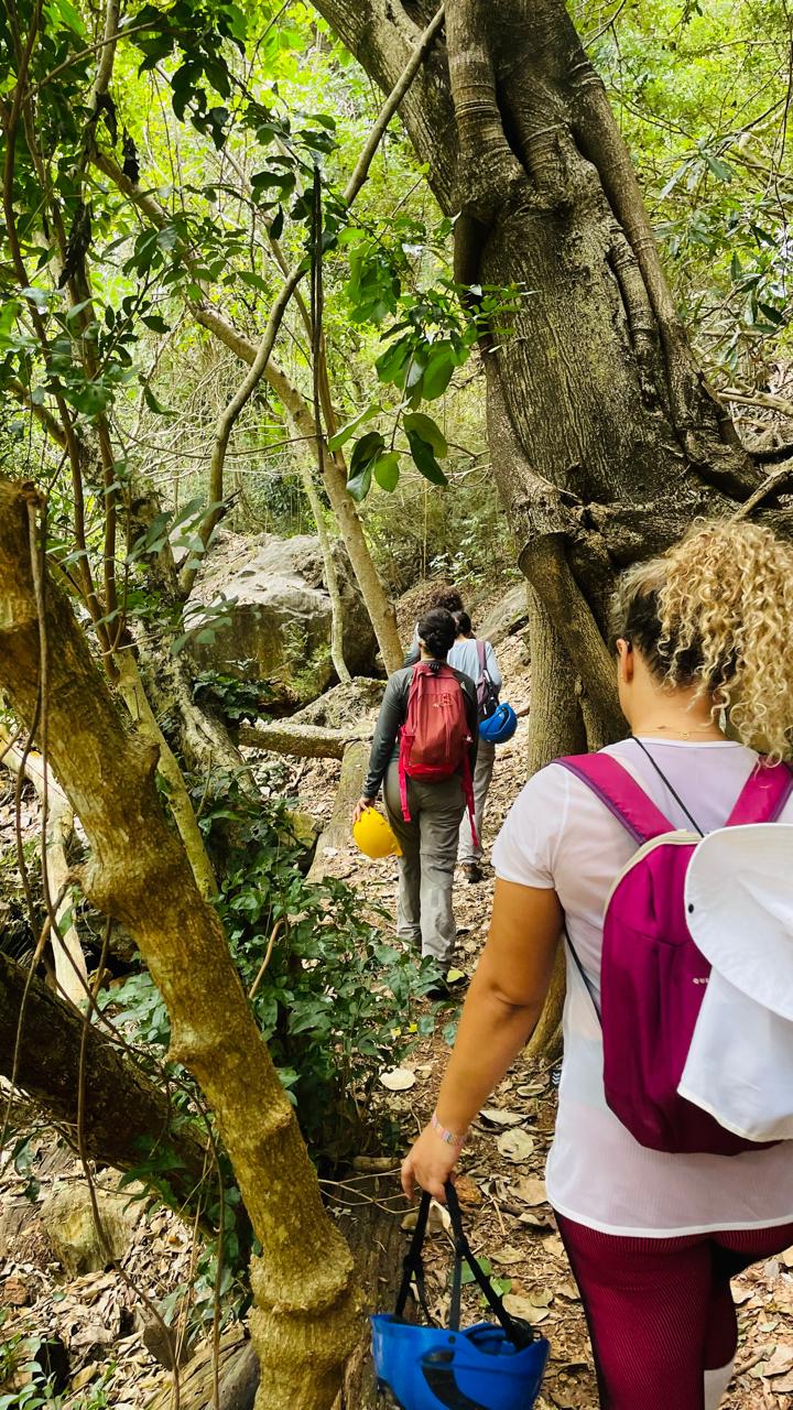 A trilha para a Gruta do Rezar é marcante: o Rio Peruaçu acompanha boa parte do percurso, em um trecho sombreado por mata ciliar e espécies nativas. Ao final da trilha, enfrentamos cerca de 500 degraus, antigos caminhos usados no século passado para rituais religiosos. A gruta impressiona pelo tamanho da entrada e pela grande quantidade de pinturas rupestres que a embelezam.